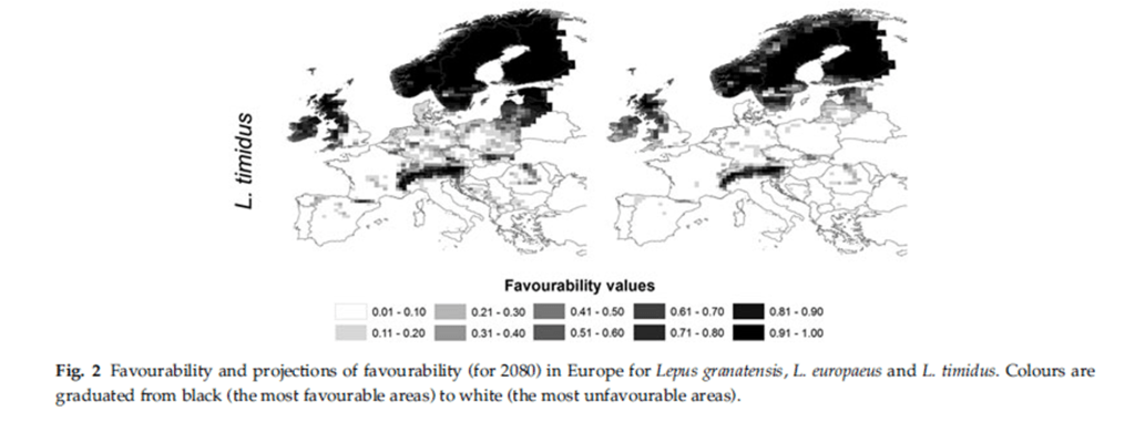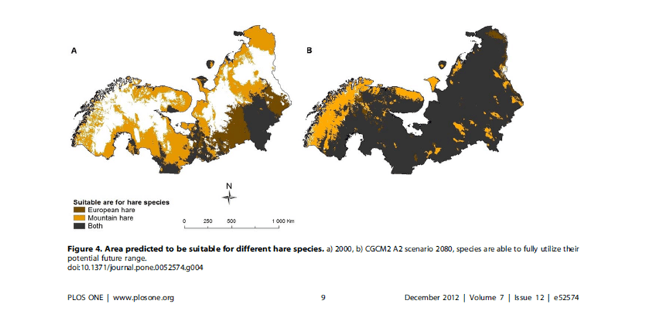 “The effects of climate change on the distribution of mountain hares predicted for 2080, especially when combined with potential exclusion by European brown hares, should drive managers to consider global climate change as one of the factors involved in mountain hare decline in Europe”