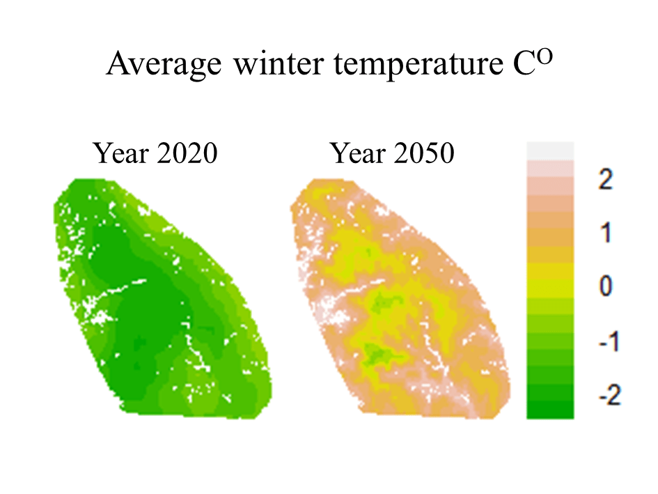 My recent investigations for the Peak District, UK, showed recent historic average winter temperature at minus 2 degrees. Because of climate change, average winter temperature for the year 2050 is forecast at plus 2 degrees. That means precipitation will fall as rain not snow. And although winters are forecast to be wetter, overall annual precipitation will decrease by 25%.