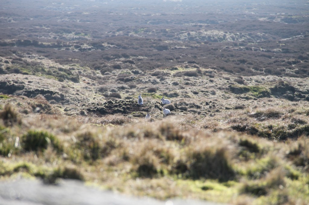 In the Peak District, one beneficial human intervention is moorland restoration conducted by Moors for the Future Partnership and RSPB Dove Stone. These organisations were tasked with protecting the upland peat layers which are important for carbon storage. Their investments in blocking gullies, raising the water table and revegetating the landscape, have yielded a verdant vibrant bog ecosystem with a wide variety of plants, shrubs and mosses. These areas are now associated with substantial numbers of mountain hares.