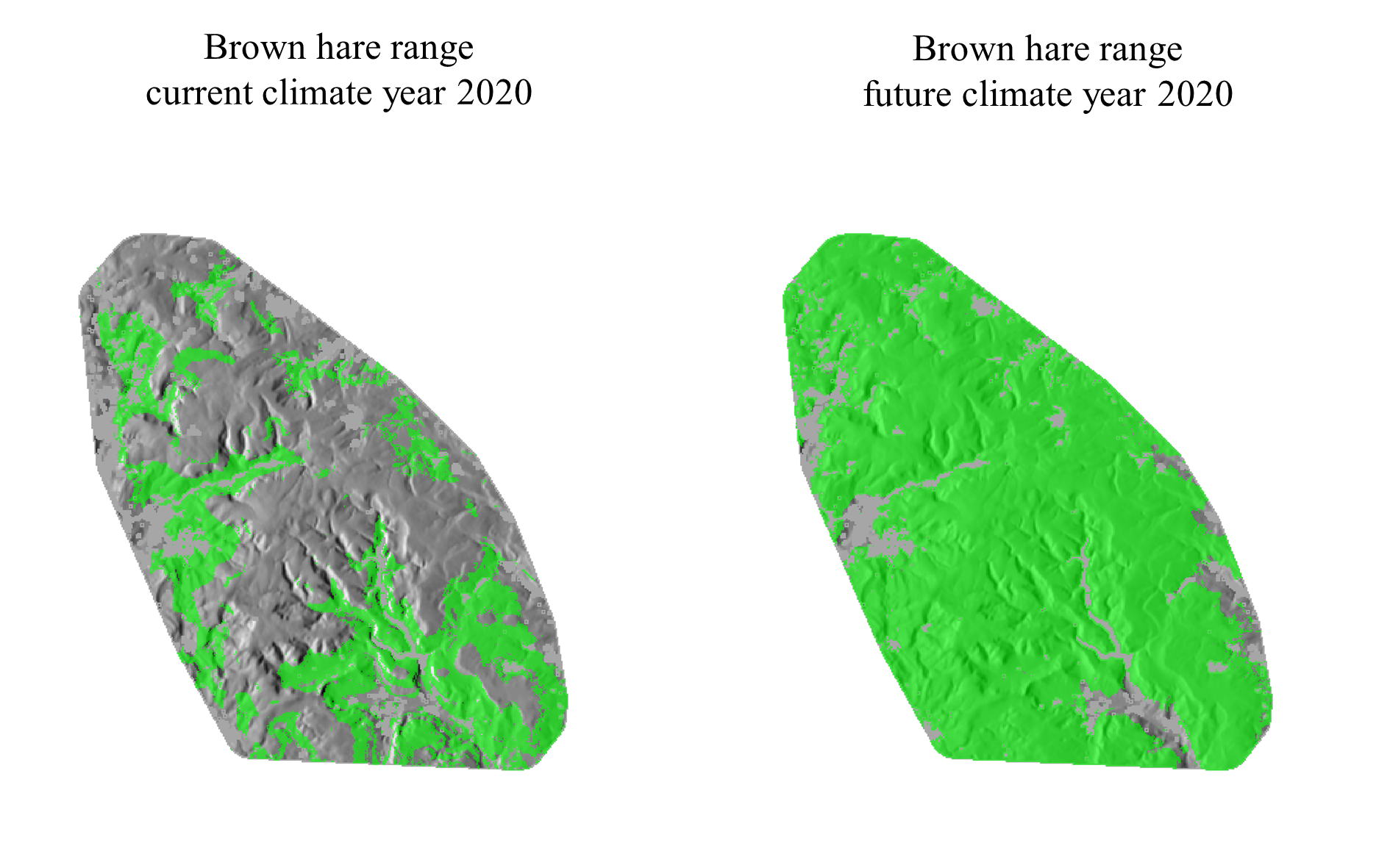 The present average elevation for brown hares is 298m. In the year 2050 it will be higher at 369m. The range of brown hares today is 252km2 . In the year 2050 it will be more than ~760km2. European brown hares will occupy and share all the ranges of mountain hares.