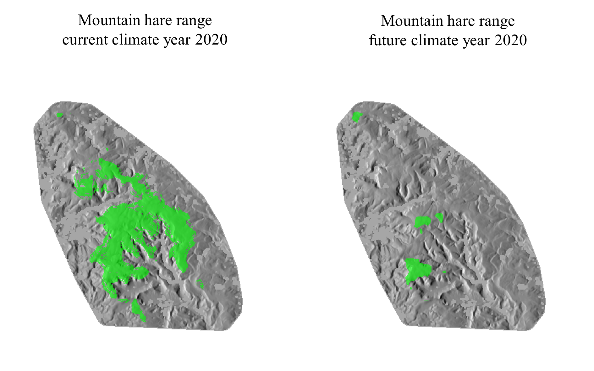 The present average elevation for mountain hares is 490m. In the year 2050 it will be higher at 570m. The range of mountain hares today is 168km2 . In the year 2050 it will be just ~20km2. Mountain hares will occupy only Kinder Scout, parts of Bleaklow and a small area near Rishworth. Those groups of mountain hares presently occupying Derwent Edges and Margery Hill will be gone.