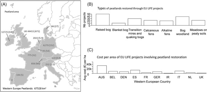 Source: Andersen, R., Farrell, C., Graf, M. Muller, F.,Calvar, E., Frankard, P., Caporn, S. & Anderson, P. (2017). An overview of the progress and challenges of peatland restoration in Western Europe. Restoration Ecology 25(2):271-282 doi: 10.1111/rec.12415