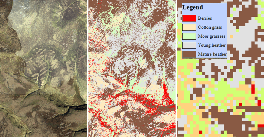 Often these peatland habitats occur as a mosaic of vegetation communities: mires, blanket bogs, heaths. Mapping these areas is a continual challenge. For my ecological niche modelling, I made a valiant attempt to categorise these with a supervised classification algorithm of aerial images. Applying five vegetation classes, this achieved 82% accuracy.